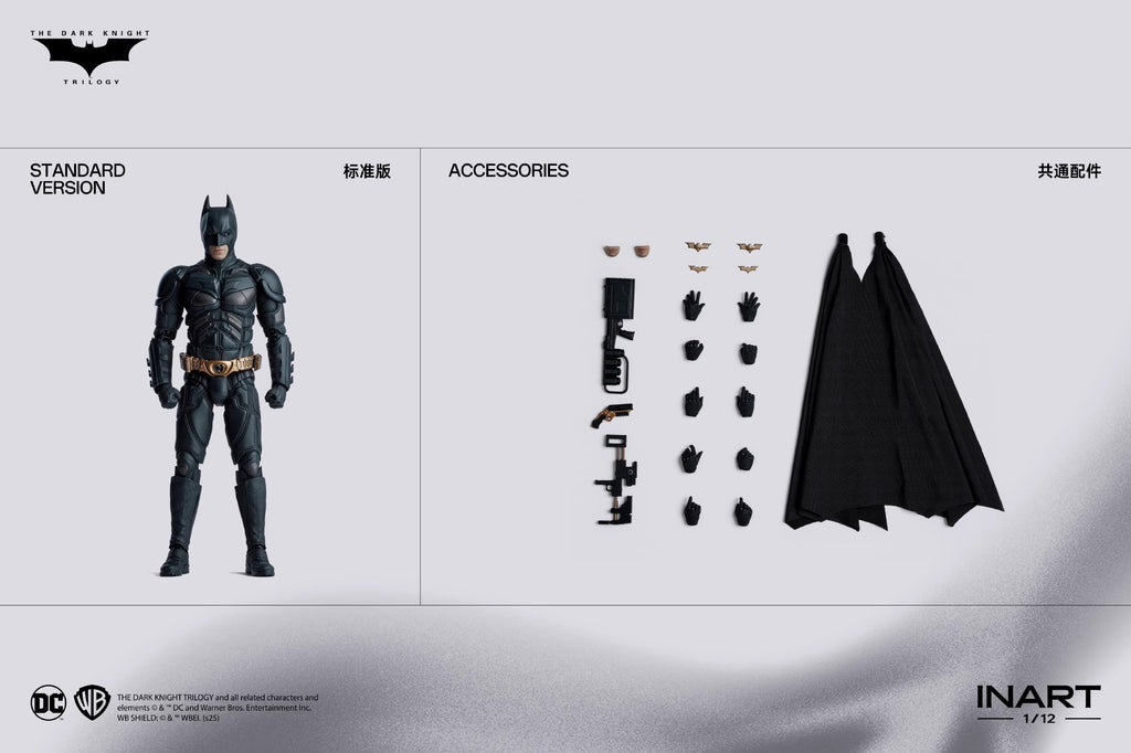 Experience the thrill of owning the iconic 1:12 Batman Dark Knight Trilogy action figure! Highly articulated joints and included weapons like the Batarang and hook gun make this a must-have for collectors. Choose from the regular or deluxe version, which comes with real head and display base. Stand tall at 17cm and add this dynamic figure to your collection now!